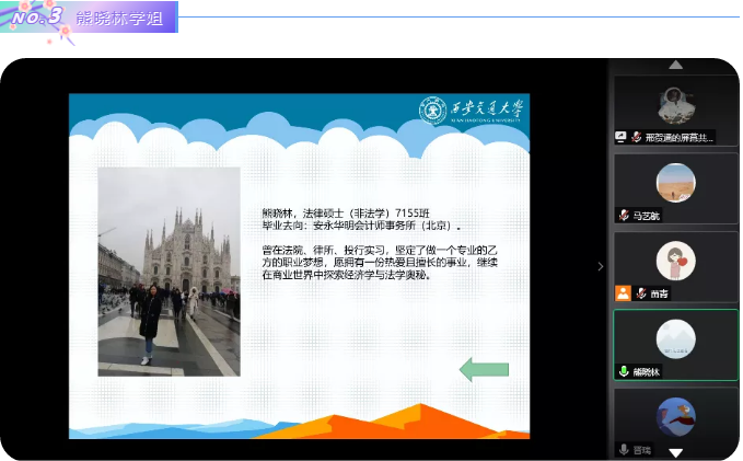 熊晓林学姐向大家分享了自己对成为一名专业乙方的向往,并向大家介绍若干知名事务所的面试流程与薪资水平。